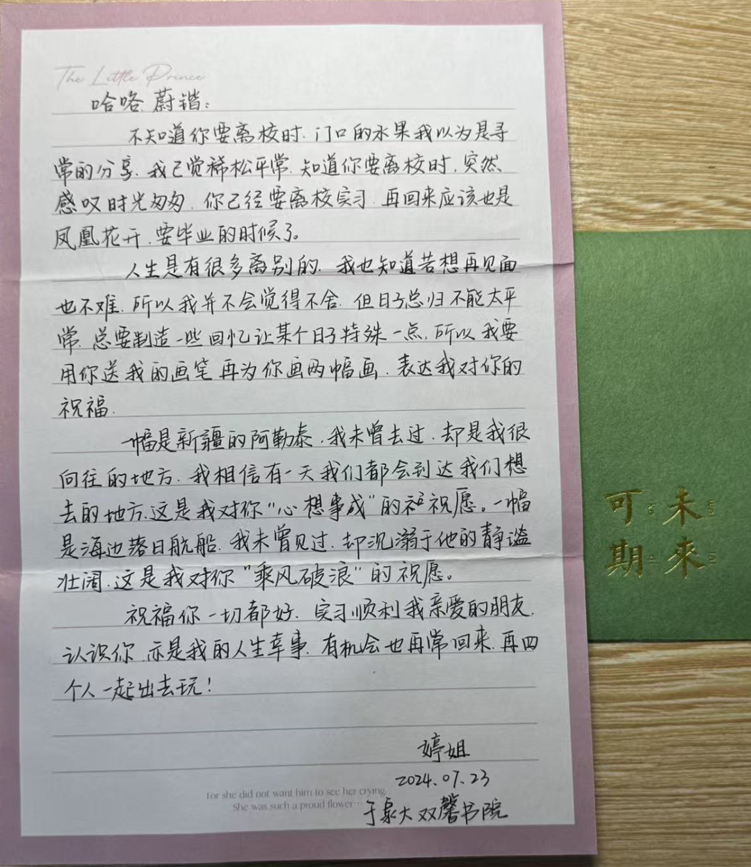 初入大学,他正在结实学好理论学问取手艺技术,成就名列前茅的他,多次正在技术竞赛中获。他下定考研的决心,无数遍背单词、刷实题,正在最困最累的时候,是父母的陪同和教员的激励,支持他继续前行。 环节时辰,双馨书院教员潘婷婷帮他阐发,改换专业课书本这件事,是所有考研学子都要面临的坚苦,并激励他不要放弃。这位经常送给他画画、给他写信的潘教员,总会正在环节时辰激励他、支撑他。 “最难受的时候,我心里解体,每天大把大把掉头发,都快支持不住了。他一咬牙挺过来。然而,正在离测验只剩一个多月时,他俄然得知专业课册本要改换的动静,人一会儿就解体了。 初入校园,他赶超模式。由于中职所学的数学较浅,大一刚开学,他发觉本人跟不上数学课的进度。于是,他操纵课后时间,到B坐上频频刷了几遍课程,花了2个月时间终究把数学课补上来。自此,他的成就一曲处于专业的前列。